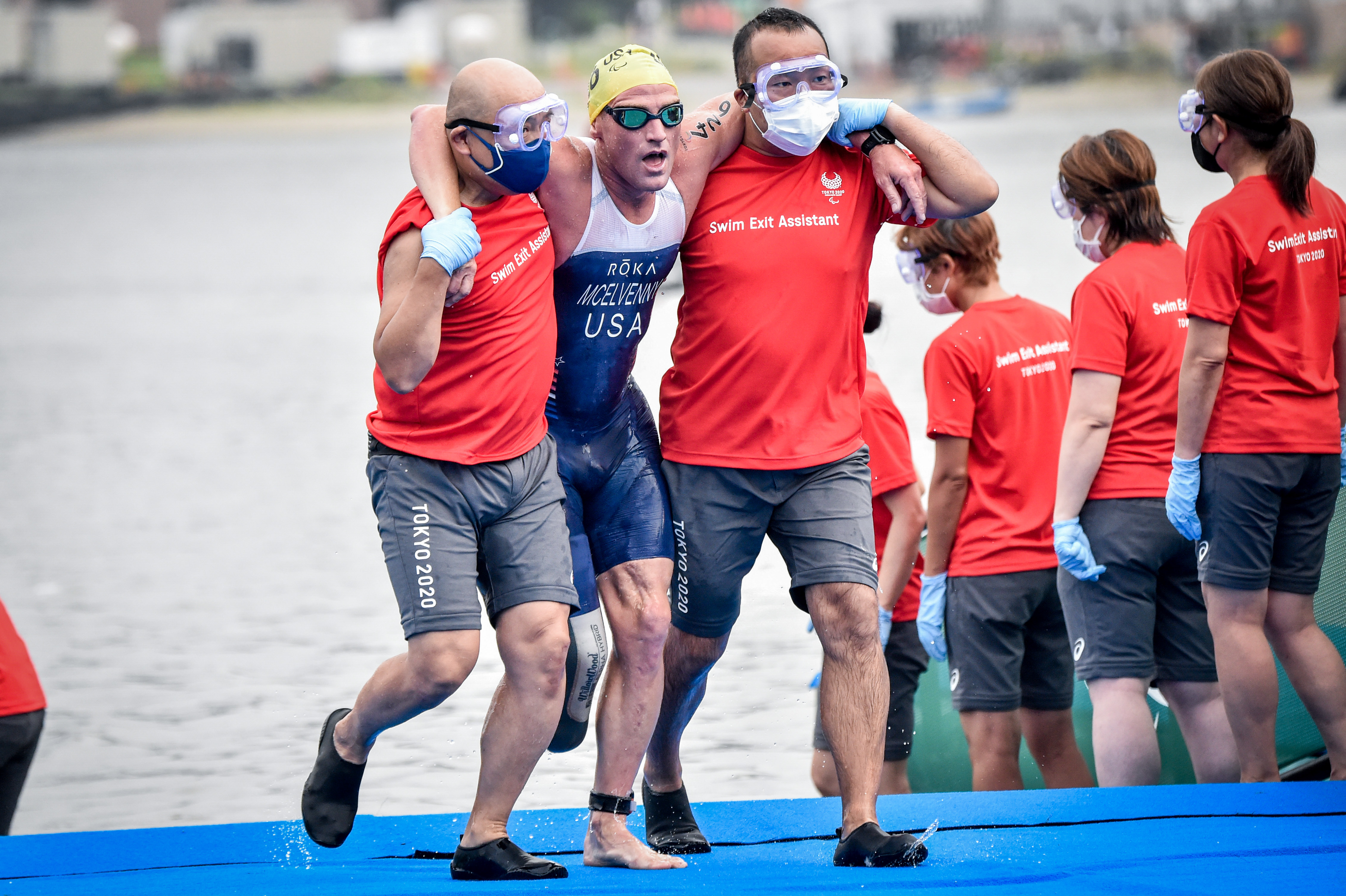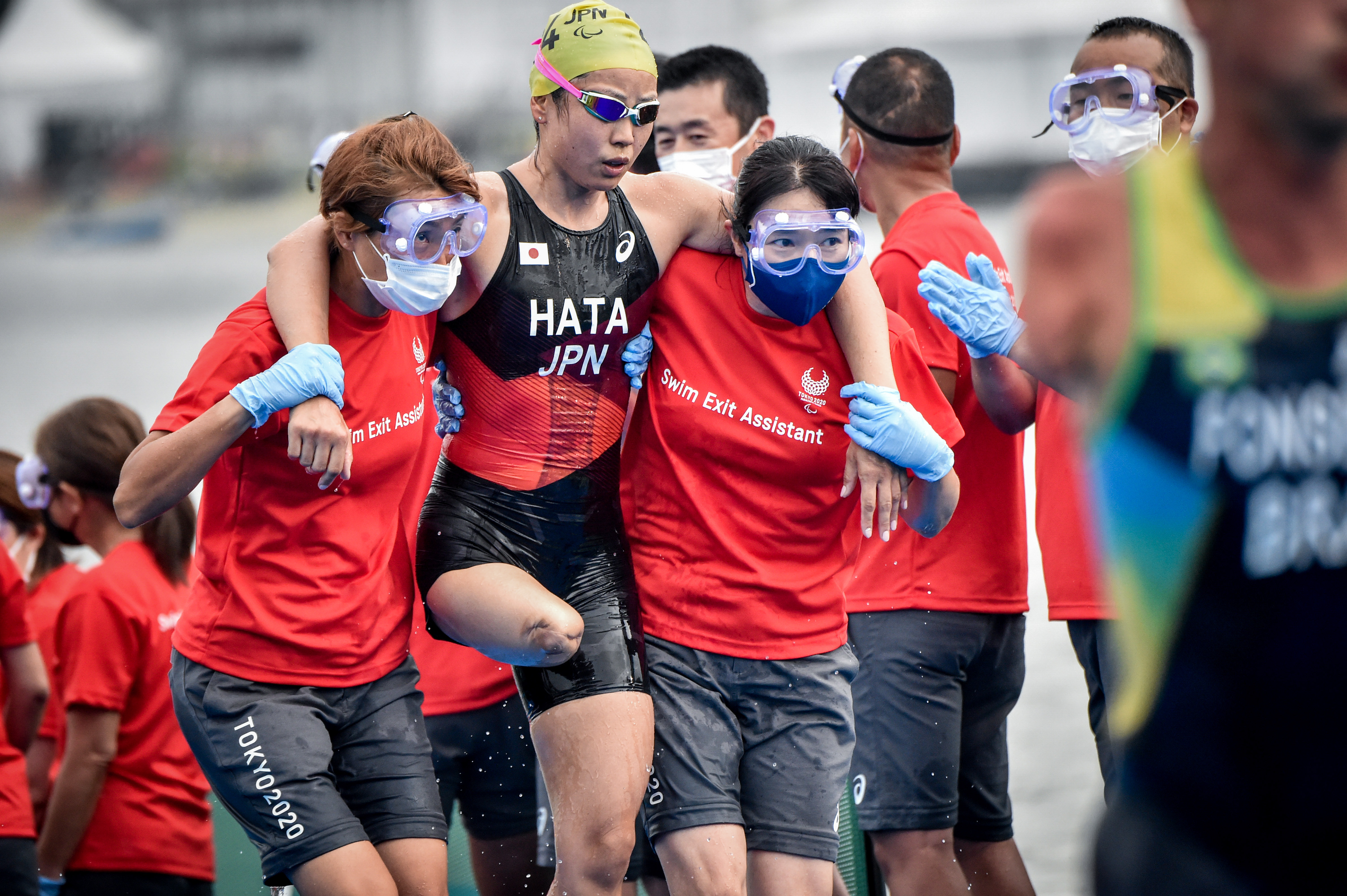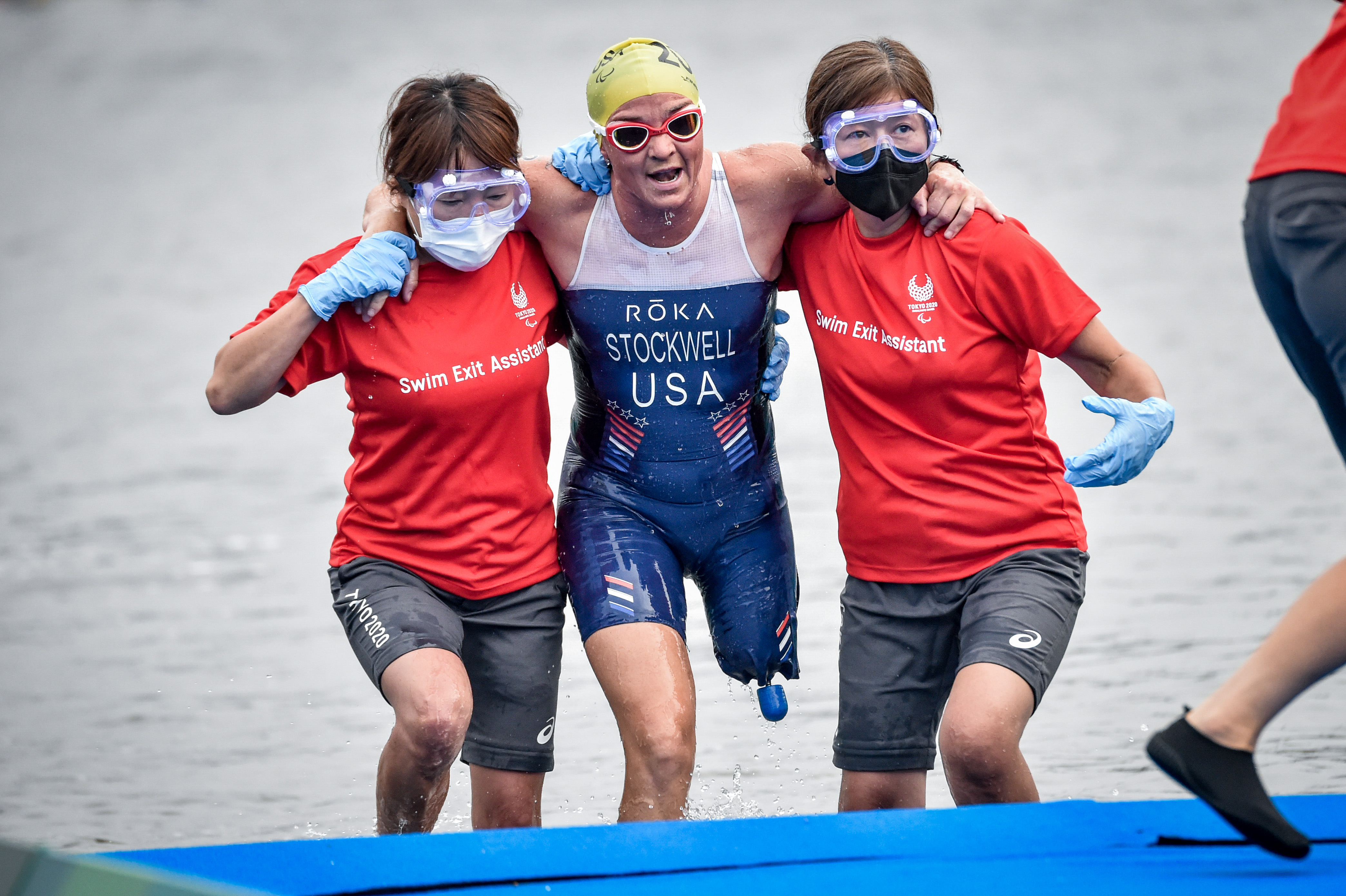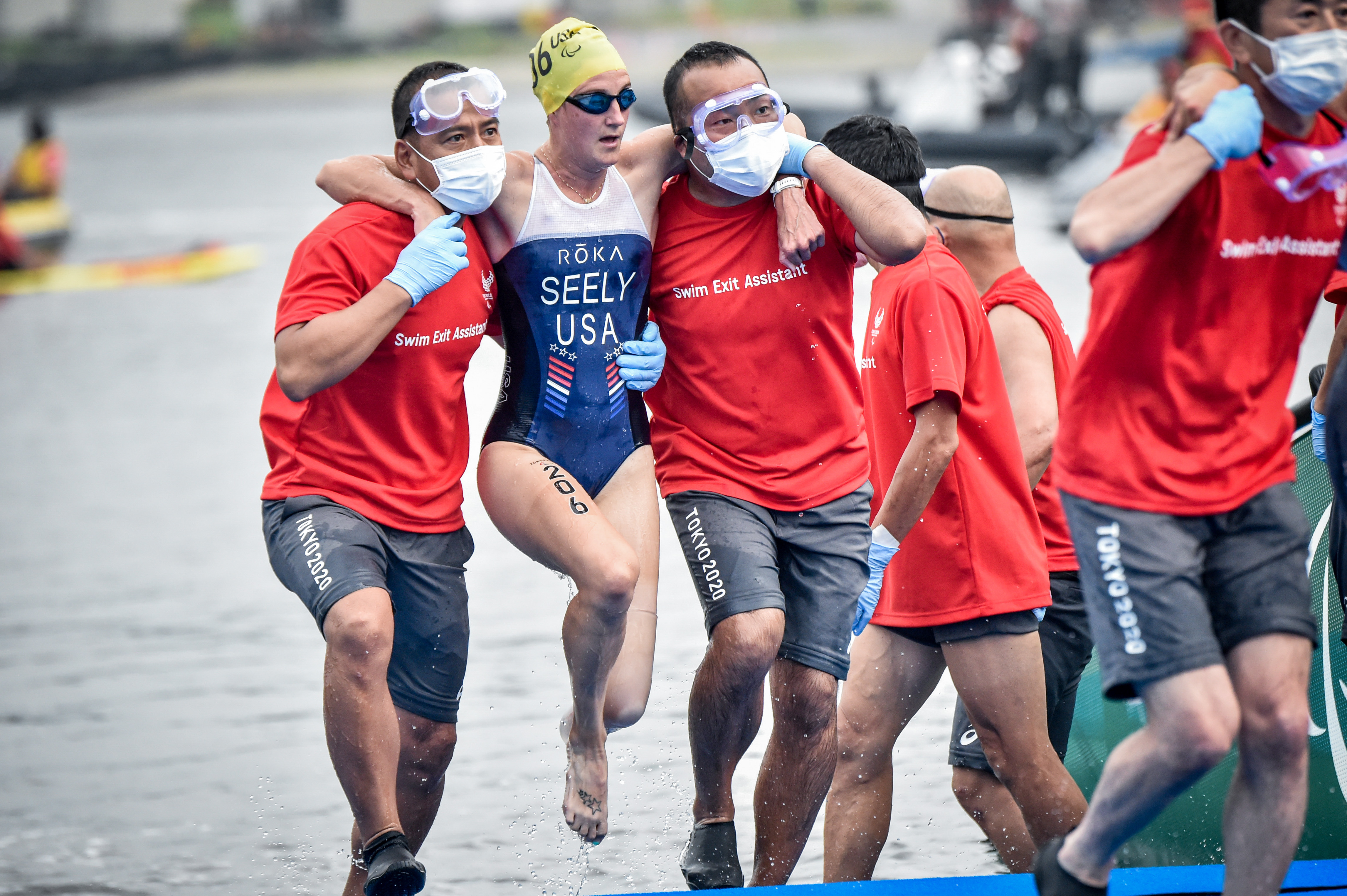 There are swim-exit assistants who may assist the athletes upon swim exit depending on the swim cap colour, providing full lifting (red swim cap) or support assistance (yellow swim cap). There is a designated pre-transition area for athletes to collect their assistive devices (PTS2 to PTS4) or access their daily wheelchairs and be stripped by their handlers if needed (PTWC).