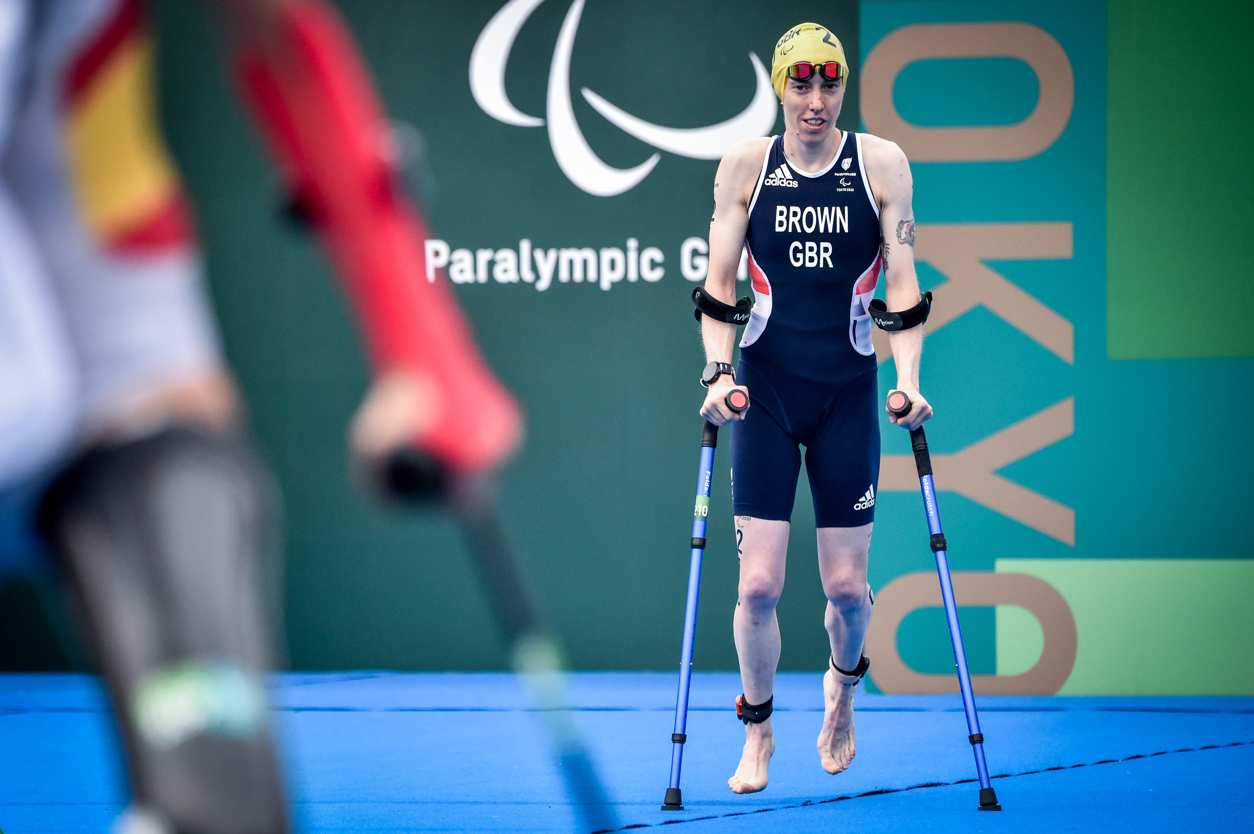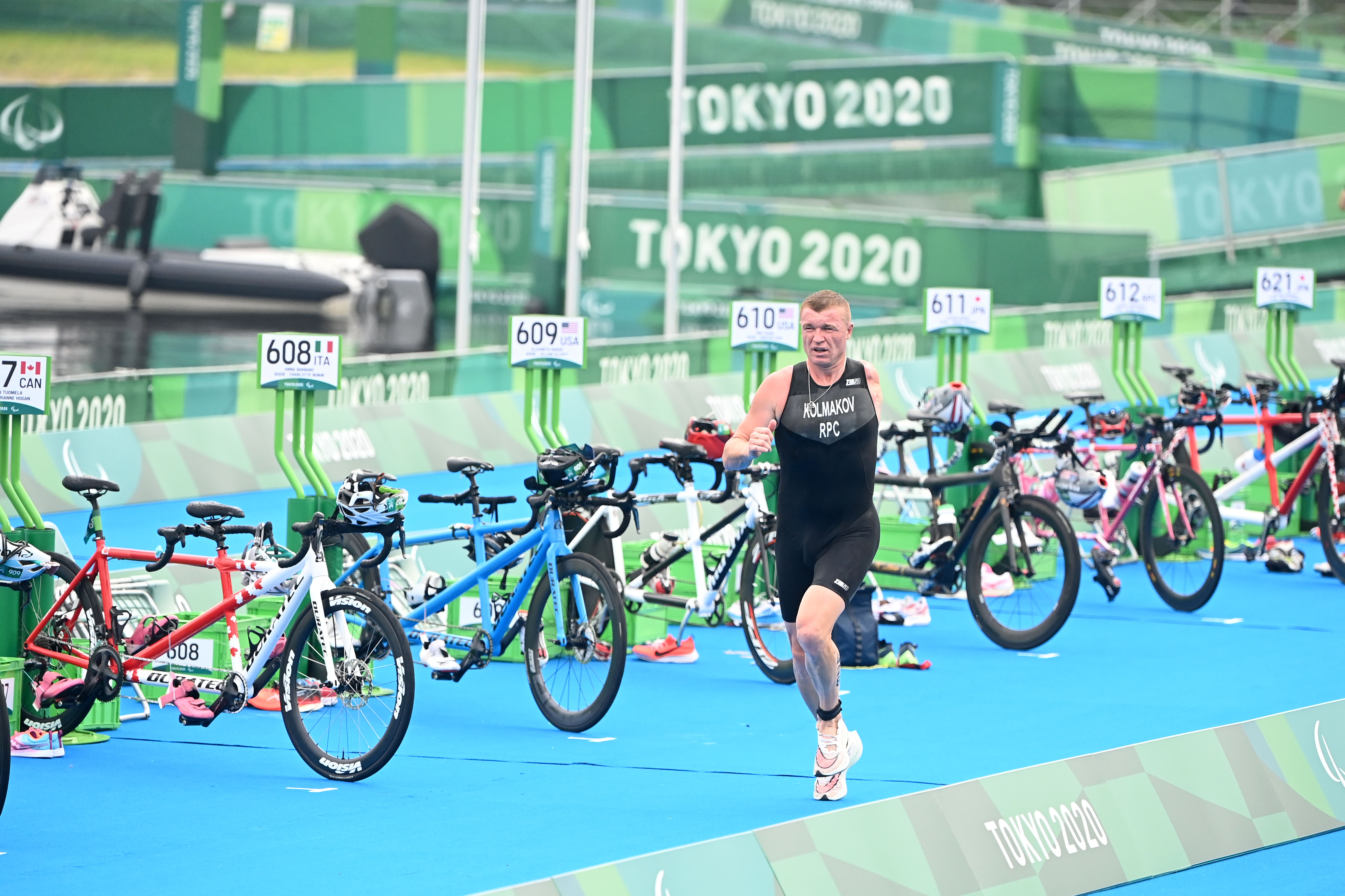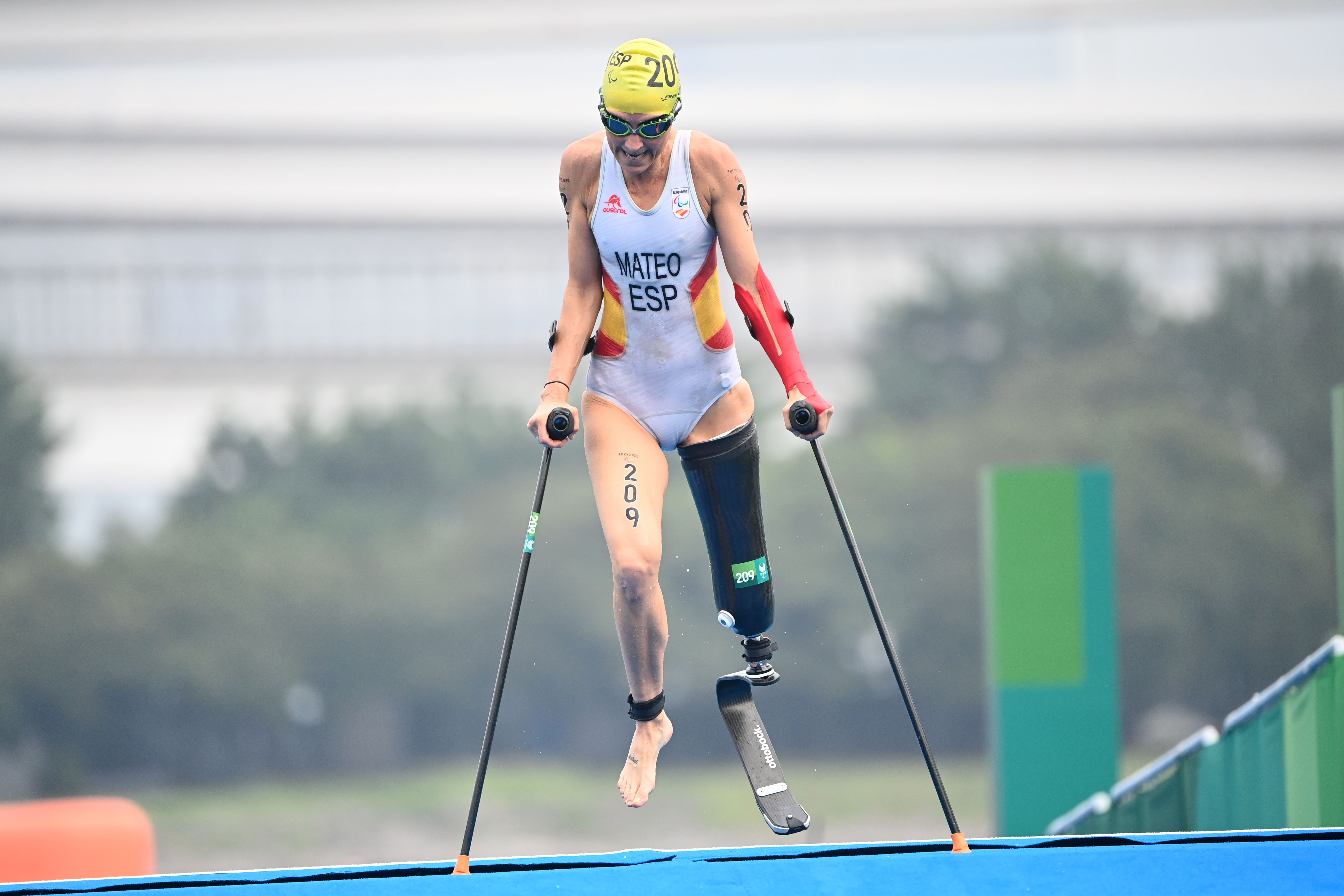 There are swim-exit assistants who may assist the athletes upon swim exit depending on the swim cap colour, providing full lifting (red swim cap) or support assistance (yellow swim cap). There is a designated pre-transition area for athletes to collect their assistive devices (PTS2 to PTS4) or access their daily wheelchairs and be stripped by their handlers if needed (PTWC).